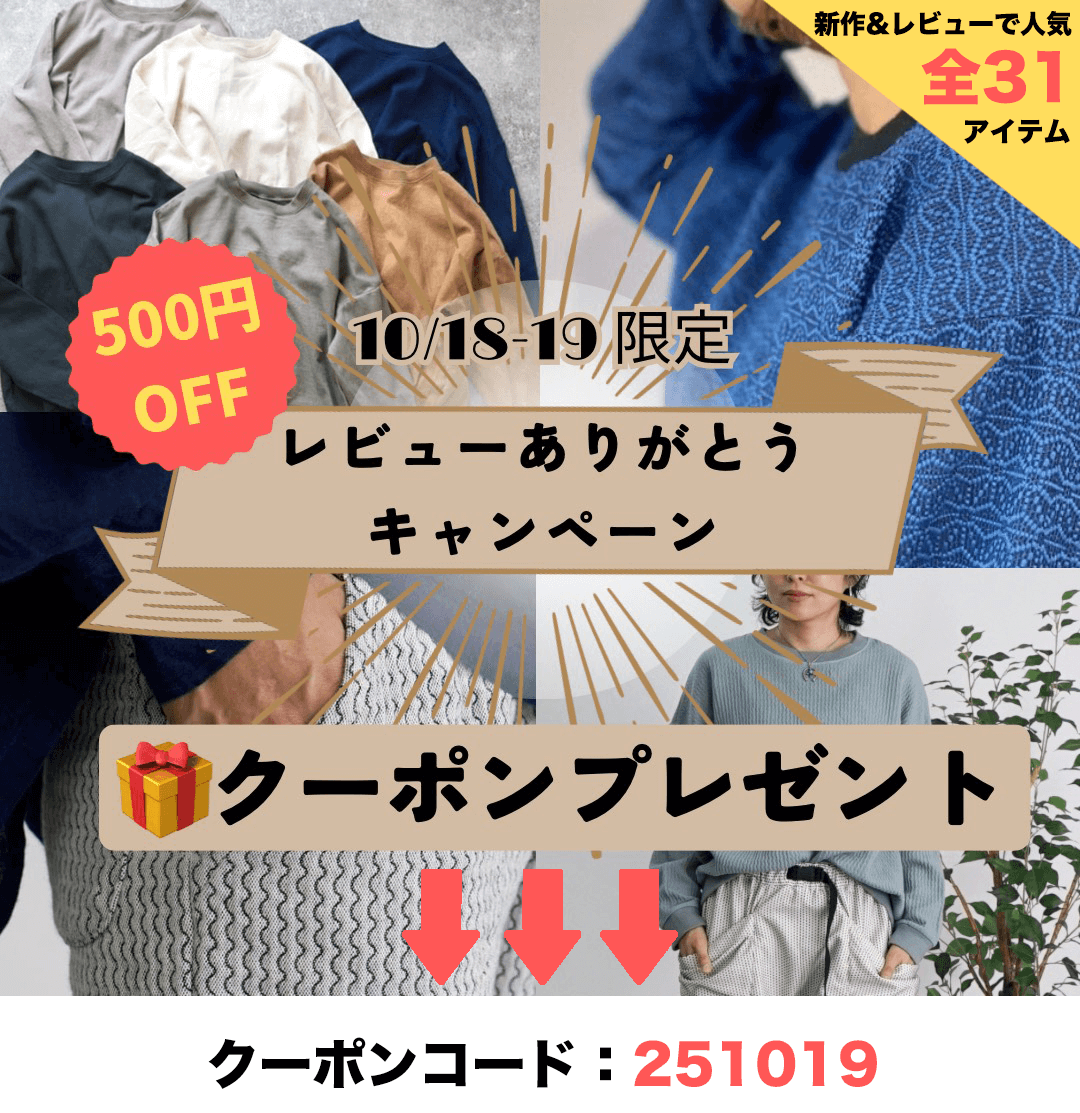 イベント情報500円OFFクーポン配布中!レビューありがとうキャンペーンで、31アイテムを特別価格で2025.10.18