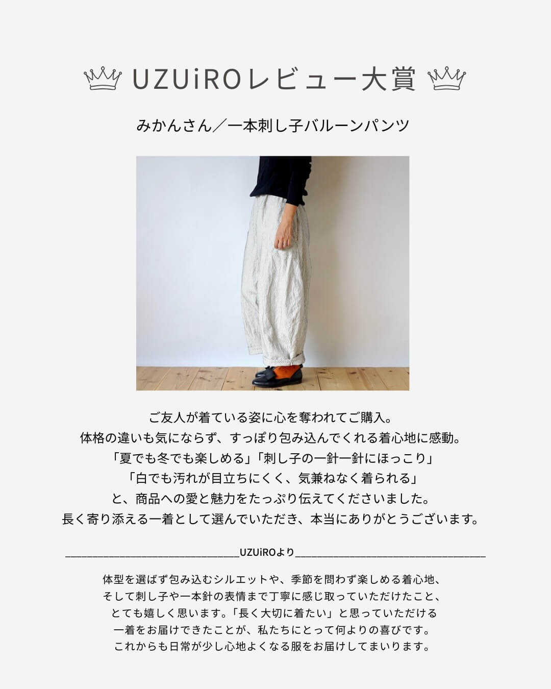 日々のお洋服選びの中で、UZUiROを思い出してくださることが、私たちにとって何よりの励みです☺️