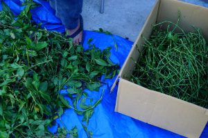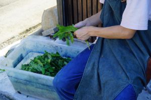 UZUiROクルー日記葉と茎を分けるのが大変。畑の一角で育てている蓼藍。2018.07.01